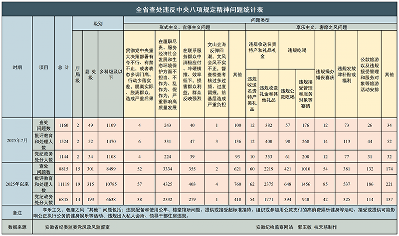 2025年7月,全省纪检监察机关共查处违反中央八项规定精神问题1160起,批评教育和处理1524人,其中党纪政务处分1144人。