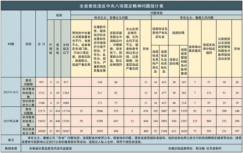 2025年10月,全省纪检监察机关共查处违反中央八项规定精神问题951起,批评教育和处理1312人,其中党纪政务处分1106人。